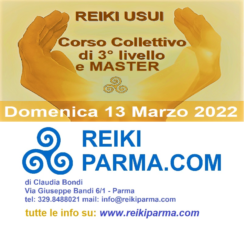 Il corso collettivo di Reiki 3° livello + Reiki Master è previsto per il giorno: Domenica 13 Marzo 2022 (Se desideri un’altra data sono a disposizione anche per corsi individuali quando ti fa più comodo!!! Visita la pagina https://www.reikiparma.com/corsi-individuali)