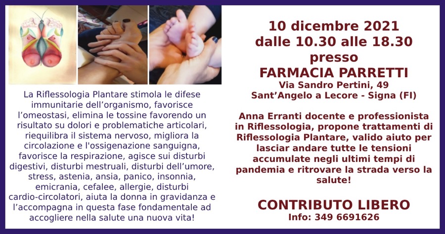 Anna Erranti docente e professionista in Riflessologia Plantare sarà presente presso la FARMACIA PARRETTI il 10 dicembre 2021 dalle ore 10,30 alle 18,30; propone trattamenti di Riflessologia Plantare, valido aiuto per lasciar andare tutte le tensioni accumulate negli ultimi tempi di pandemia e ritrovare la strada verso la salute!